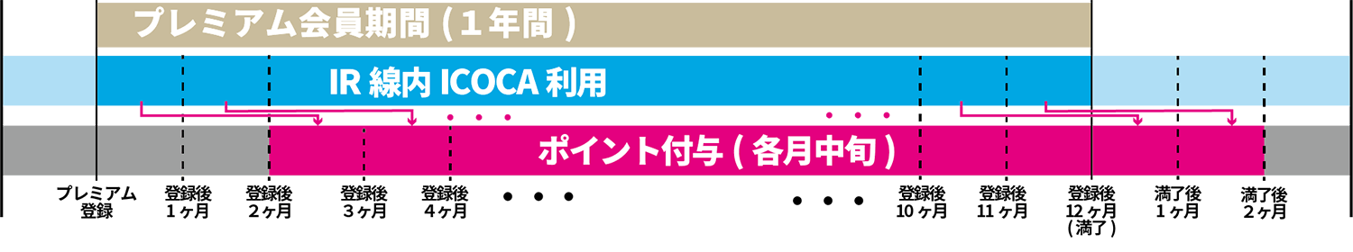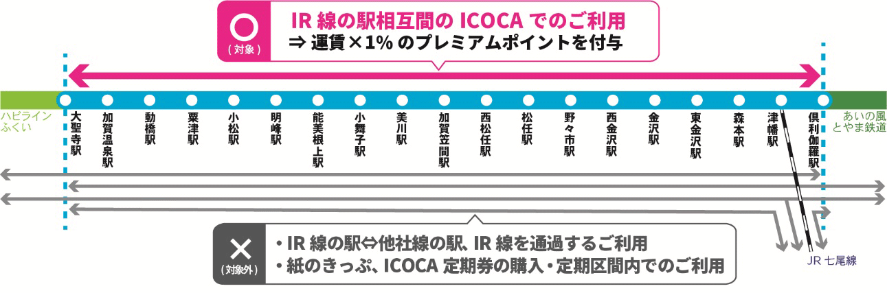 プレミアム会員による当社線(大聖寺駅~倶利伽羅駅間)の駅相互間でのICOCAでのご利用(ICOCA定期券を除く)に対して、運賃×1%のポイントを付与します。