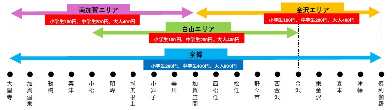 南加賀エリア | 小学生 100円 中学生 200円 大 人 400円 | 小学生 660円 中学生 1,340円 大 人 1,340円 | 小学生 ▲85% 中学生 ▲85% 大 人 ▲70% |