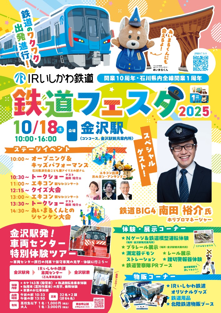 IRいしかわ鉄道では、10月18日(土)に「IRいしかわ鉄道フェスタ2025」を開催します。本年は、開業10周年・全線開業1周年という節目の年。これを記念し、例年以上に充実した内容でイベントをお届けします。今回の目玉は、鉄道BIG4でおなじみの南田裕介さんによるスペシャルトークショーと、金沢駅発・車両センター特別体験ツアー!車両センターでは、キヤ143形気動車(除雪車)や軌陸車など保守車両の体験・見学ができます。このほか、ステージパフォーマンス、鉄道お仕事体験、グッズ販売、ジオラマ運転体験など内容盛りだくさん!ぜひ、当日はIRいしかわ鉄道をご利用のうえ、金沢駅へお越しください。
