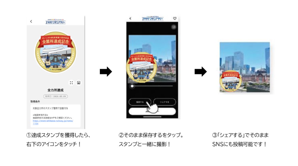(1)「思い出にスタンプ」機能を使い、ラリー中の記念写真(駅舎または施設)に全カ所達成スタンプを押した画像を作成する。