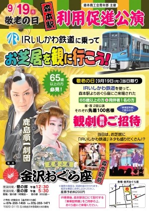 9月19日敬老の日、IRいしかわ鉄道で森本駅までご利用になり、金沢おぐら座にご来場いただいた「65歳以上の方及び同伴者の方1名」昼・夜2回公演それぞれ先着100名様を、金沢おぐら座で公演される観劇に無料ご招待いたします。