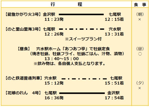 ※ IR・JR乗車券・特急券、のと鉄道のと里山里海号等の代金、スイーツプラン及び昼食代(飲み物代を除く)が含まれます。