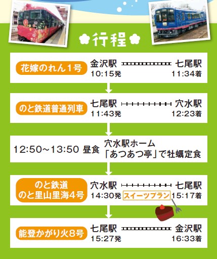 ※ IR・JR乗車券・特急券、のと鉄道のと里山里海号等の代金、スイーツプラン及び昼食代(飲み物代を除く)が含まれます。