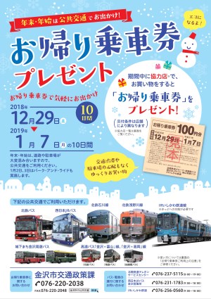 期間中、金沢駅周辺やまちなかの協力店舗および商店街加盟店において、一定額以上のお買い物・飲食をした方を対象に、帰りの電車及びバスの乗車券「お帰り乗車券」(300円分または200円分)をプレゼントします(先着順)。