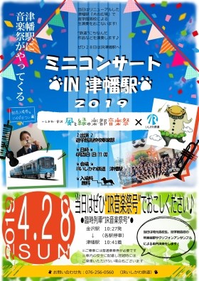 列車内や津幡駅において、同音楽祭に出演する地元高校生による吹奏楽の演奏をお楽しみいただけます。皆さまのご乗車・ご来場をお待ちしております♪