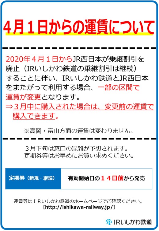 2020年4月1日からJR西日本が乗り継ぎ割引を廃止(IRいしかわ鉄道の乗継割引は継続)することに伴い、IRいしかわ鉄道とJR西日本をまたがって利用する場合の運賃が変更となります。