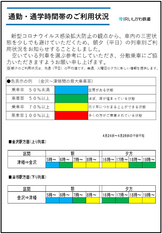 新型コロナウイルス感染防止の観点から、車内の三密状態を少しでも避けていただくため、朝夕(平日)の列車別ご利用状況をお知らせすることとしました。