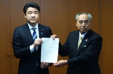 写真:左から 野上浩太郎国土交通副大臣、弊社社長七野利明