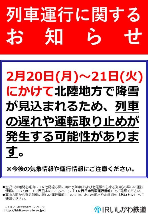 2月20日(月)~21日(火)降雪の影響による列車の運行について(IRいしかわ鉄道線)