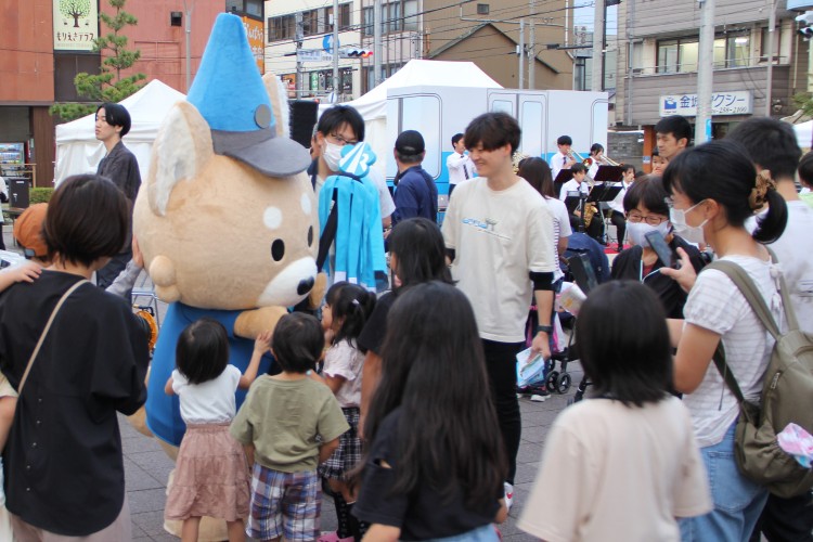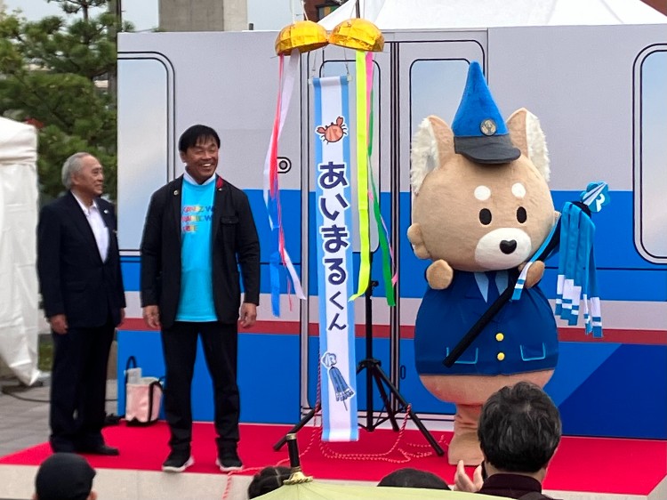 10月1日(日)に森本駅東広場で開催した「秋の鉄道フェスタ2023」では、ステージに設けられた電車のドアから当社公式マスコットキャラクターが初登場し、来場の皆さまとくす玉を割って、「あいまるくん」の愛称を発表しました。記念写真の撮影に応じたほか、16時52分発の金沢行きの列車で出発合図を務めました。