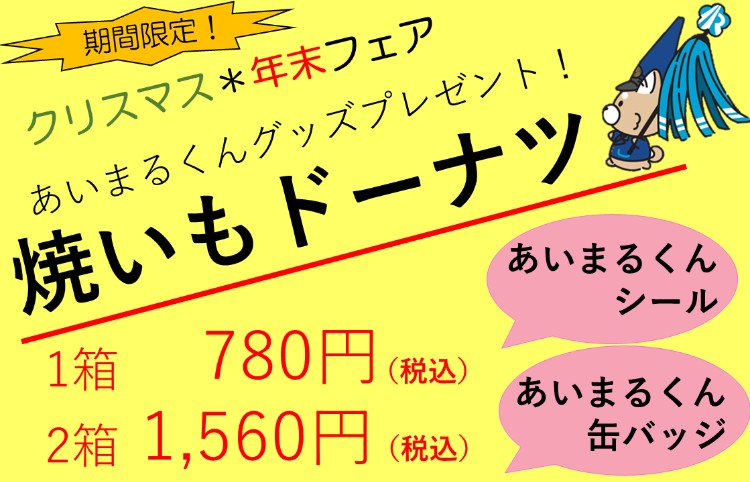 焼いもドーナツ2箱購入⇒あいまるくん缶バッジプレゼント!