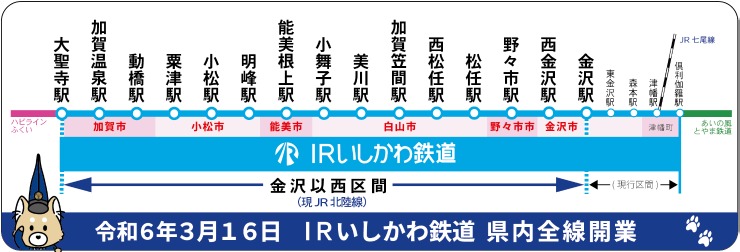 IRいしかわ鉄道は、令和6年(2024 年)3月16日(土)の北陸新幹線金沢・敦賀間開業に伴い、新たに金沢以西区間(大聖寺駅~金沢駅間)の運行を開始し、並行在来線の県内全線区間(大聖寺駅~倶利伽羅駅間)を開業することとなります。