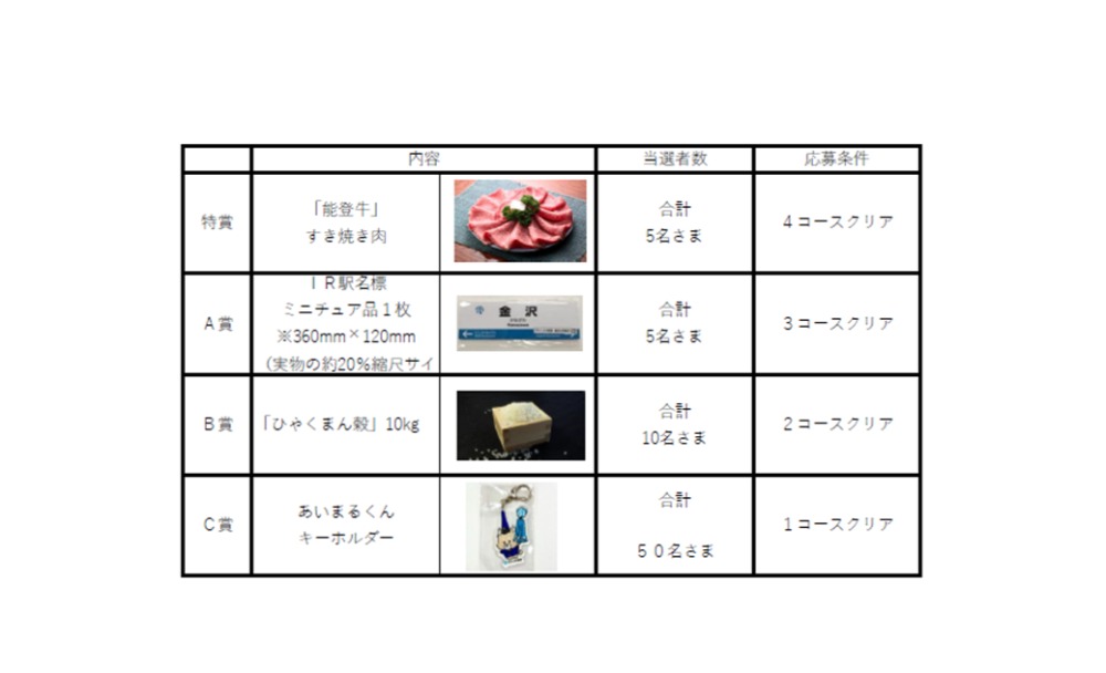 クリアしたコース数に応じて特産品やIRいしかわ鉄道グッズに応募ができます。①IRいしかわ鉄道コースをクリアした方には、参加賞を差し上げます。