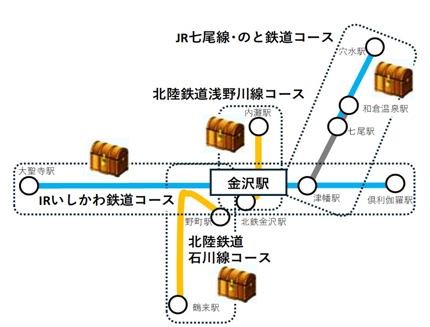 イベントには金沢駅を起点に4つのコースがあり、金沢駅を含めた2つの駅で手がかりを手に入れることで謎を解き、