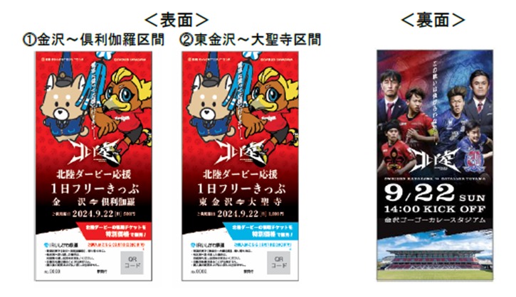 IRいしかわ鉄道では、2024年2月に「ツエーゲン金沢」のホームスタジアム(金沢ゴーゴーカレースタジアム)が開業し、東金沢駅が最寄り駅になって以降、多くのサッカーファンの方にご利用いただいていることから、9月22日(日)に開催されるJ3リーグ公式戦「ツエーゲン金沢VSカターレ富山」(北陸ダービー)を盛り上げる新たな取り組みとして「北陸ダービー応援1日フリーきっぷ」を販売します。