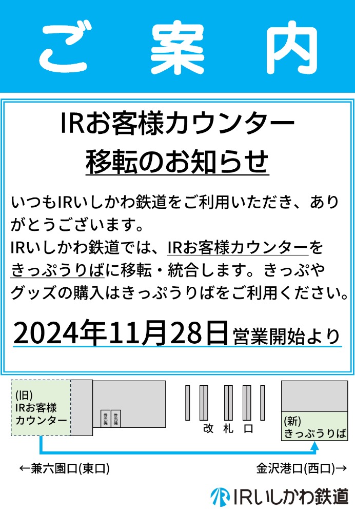 IRいしかわ鉄道では、IRお客さまカウンターをきっぷうりばに移転・統合します。2024年11月28日(木)営業開始より、きっぷやグッズの購入はきっぷうりばをご利用ください。