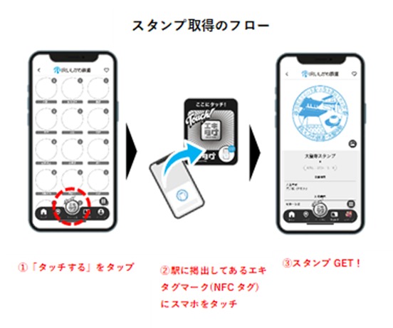 駅などに設置されたエキタグマーク(NFC タグ)をスマートフォンで読み込むことで、設置された場所のスタンプをアプリ内のデジタルスタンプ帳に収集することができるアプリサービスです。